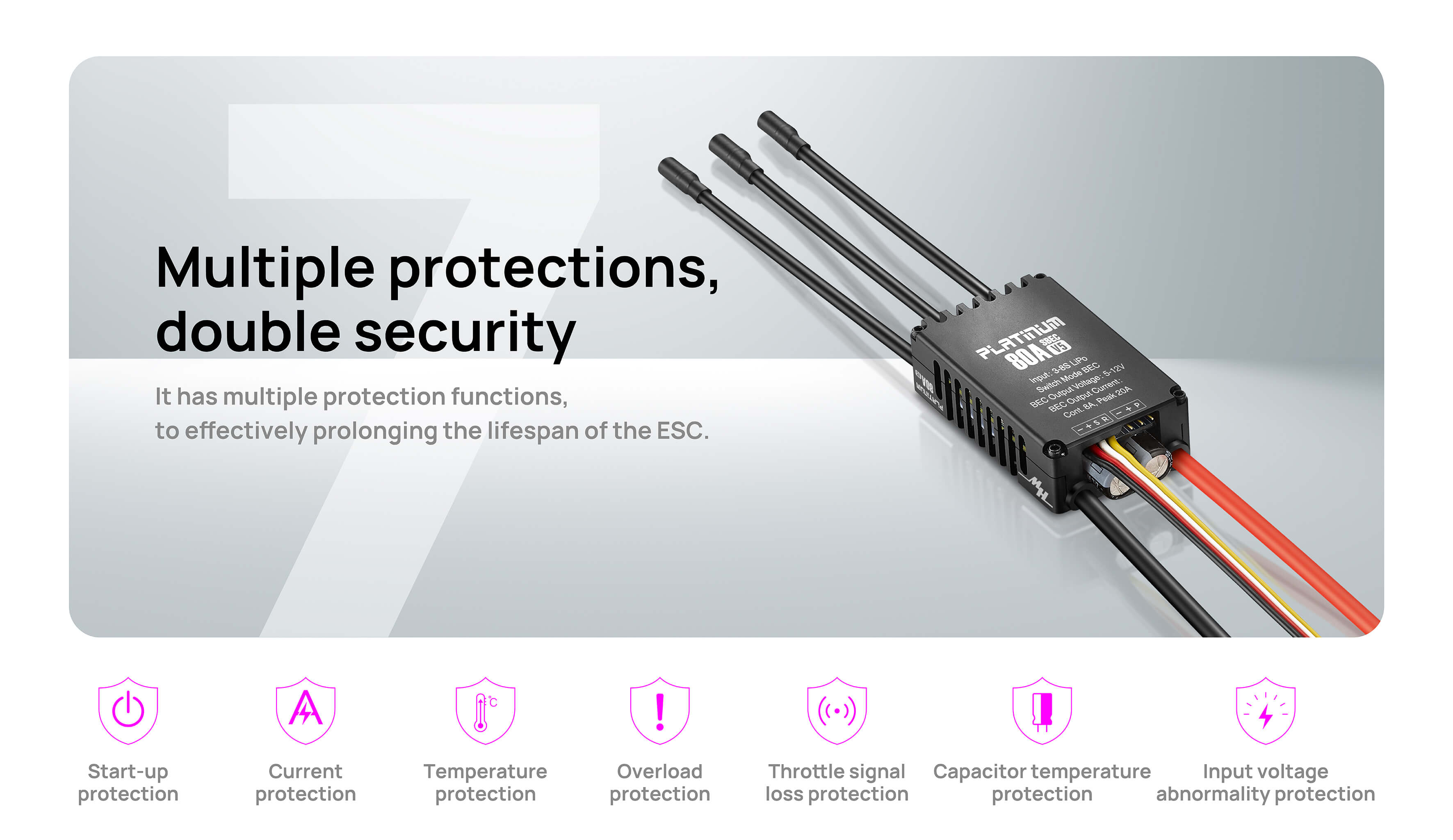 此外,Platinum 80A V5电调还具备启动保护、电流保护、温度保护、过负荷保护、油门信号丢失保护、电容温度保护、输入电压异常保护等功能,有效延长使用寿命,为每一次飞行保驾护航。